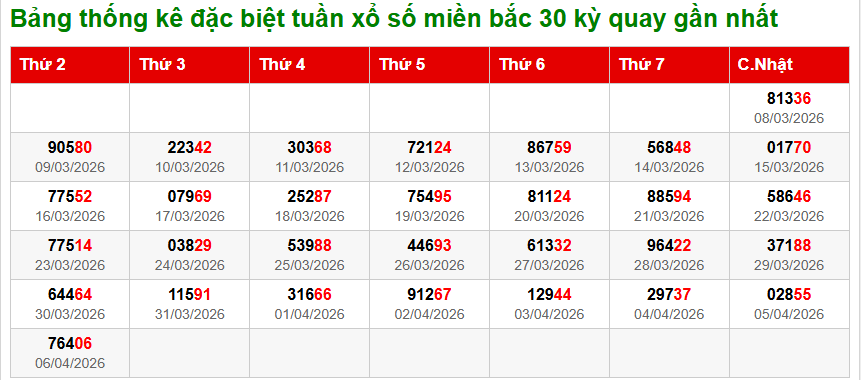 Bảng thống kê đặc biệt tháng 30 ngày gần nhất