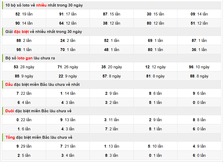 Việc lựa chọn các con số lô đề gan đề chơi, các bạn cần phải tìm hiểu thật kỹ các chu kỳ max gan và cần phối hợp thêm các nhịp cầu có báo hiệu về cùng thêm nhiều phương pháp soi cầu khác nhau để đưa ra một cặp số đẹp nhất ngày để chơi, và dưới đây là tổng hợp thống kê : 10 bộ số loto về nhiều nhất trong 30 ngày, giải đặc biệt về nhiều nhất trong 30 ngày, Bộ loto gan lâu chưa ra, đầu đặc biệt miền Bắc lâu chưa về, Đuôi đặc biệt miền bắc lâu chưa về, Tổng đặc biệt miền bắc lâu chưa ra nhất. Các bạn tham khảo ngay hình ảnh dưới đây :