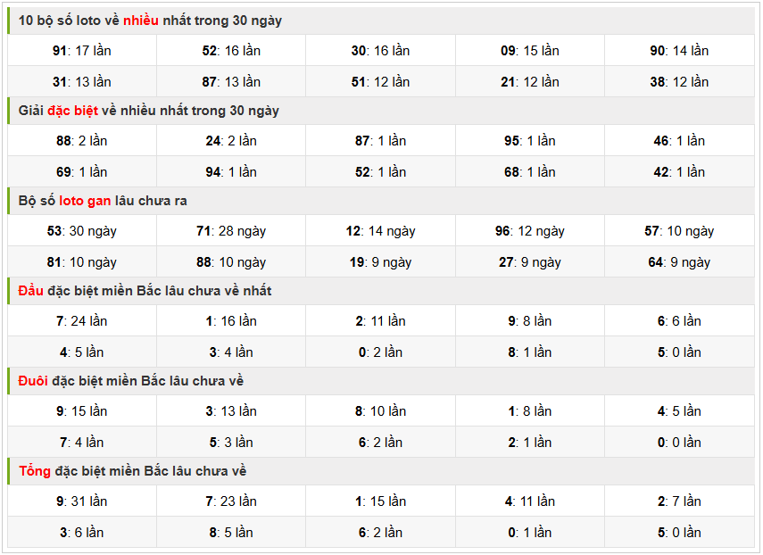 Việc lựa chọn các con số lô đề gan đề chơi, các bạn cần phải tìm hiểu thật kỹ các chu kỳ max gan và cần phối hợp thêm các nhịp cầu có báo hiệu về cùng thêm nhiều phương pháp soi cầu khác nhau để đưa ra một cặp số đẹp nhất ngày để chơi, và dưới đây là tổng hợp thống kê : 10 bộ số loto về nhiều nhất trong 30 ngày, giải đặc biệt về nhiều nhất trong 30 ngày, Bộ loto gan lâu chưa ra, đầu đặc biệt miền Bắc lâu chưa về, Đuôi đặc biệt miền bắc lâu chưa về, Tổng đặc biệt miền bắc lâu chưa ra nhất. Các bạn tham khảo ngay hình ảnh dưới đây :
