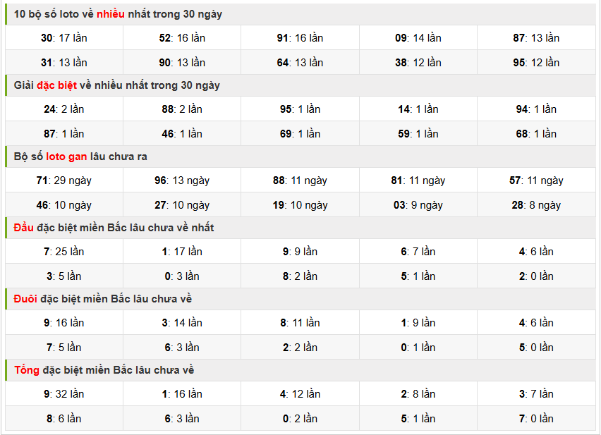 Việc lựa chọn các con số lô đề gan đề chơi, các bạn cần phải tìm hiểu thật kỹ các chu kỳ max gan và cần phối hợp thêm các nhịp cầu có báo hiệu về cùng thêm nhiều phương pháp soi cầu khác nhau để đưa ra một cặp số đẹp nhất ngày để chơi, và dưới đây là tổng hợp thống kê : 10 bộ số loto về nhiều nhất trong 30 ngày, giải đặc biệt về nhiều nhất trong 30 ngày, Bộ loto gan lâu chưa ra, đầu đặc biệt miền Bắc lâu chưa về, Đuôi đặc biệt miền bắc lâu chưa về, Tổng đặc biệt miền bắc lâu chưa ra nhất. Các bạn tham khảo ngay hình ảnh dưới đây :