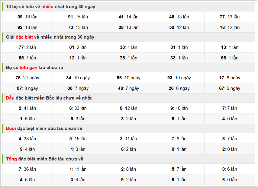 Việc lựa chọn các con số lô đề gan đề chơi, các bạn cần phải tìm hiểu thật kỹ các chu kỹ max gan và cần phối hợp thêm các nhịp cầu có báo hiệu về cùng thêm nhiều phương pháp soi cầu khác nhau để đưa ra một cặp số đẹp nhất ngày để chơi, và dưới đây là tổng hợp thống kê : 10 bộ số loto về nhiều nhất trong 30 ngày, giải đặc biệt về nhiều nhất trong 30 ngày, Bộ loto gan lâu chưa ra, đầu đặc biệt miền Bắc lâu chưa về, Đuôi đặc biệt miền bắc lâu chưa về, Tổng đặc biệt miền bắc lâu chưa ra nhất. Các bạn tham khảo ngay hình ảnh dưới đây :