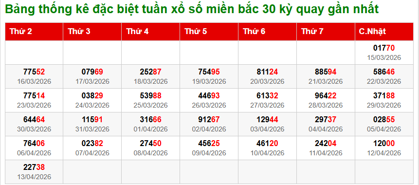 Bảng thống kê đặc biệt tháng 30 ngày gần nhất