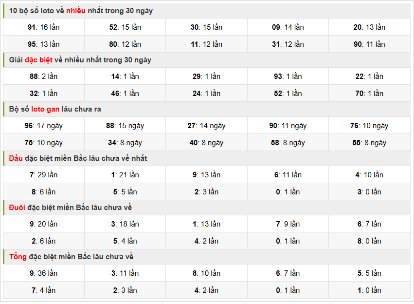 Việc lựa chọn các con số lô đề gan đề chơi, các bạn cần phải tìm hiểu thật kỹ các chu kỳ max gan và cần phối hợp thêm các nhịp cầu có báo hiệu về cùng thêm nhiều phương pháp soi cầu khác nhau để đưa ra một cặp số đẹp nhất ngày để chơi, và dưới đây là tổng hợp thống kê : 10 bộ số loto về nhiều nhất trong 30 ngày, giải đặc biệt về nhiều nhất trong 30 ngày, Bộ loto gan lâu chưa ra, đầu đặc biệt miền Bắc lâu chưa về, Đuôi đặc biệt miền bắc lâu chưa về, Tổng đặc biệt miền bắc lâu chưa ra nhất. Các bạn tham khảo ngay hình ảnh dưới đây :