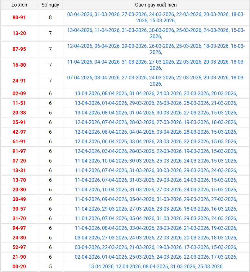 Bảng thống kê lô gan miền bắc ngày 14/04/2026