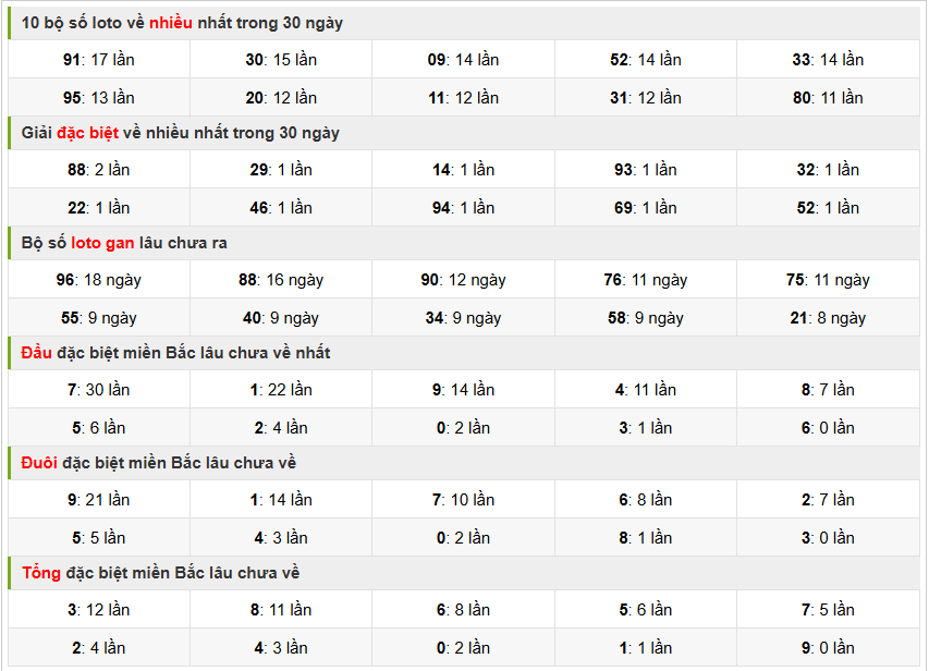 Việc lựa chọn các con số lô đề gan đề chơi, các bạn cần phải tìm hiểu thật kỹ các chu kỳ max gan và cần phối hợp thêm các nhịp cầu có báo hiệu về cùng thêm nhiều phương pháp soi cầu khác nhau để đưa ra một cặp số đẹp nhất ngày để chơi, và dưới đây là tổng hợp thống kê : 10 bộ số loto về nhiều nhất trong 30 ngày, giải đặc biệt về nhiều nhất trong 30 ngày, Bộ loto gan lâu chưa ra, đầu đặc biệt miền Bắc lâu chưa về, Đuôi đặc biệt miền bắc lâu chưa về, Tổng đặc biệt miền bắc lâu chưa ra nhất. Các bạn tham khảo ngay hình ảnh dưới đây :